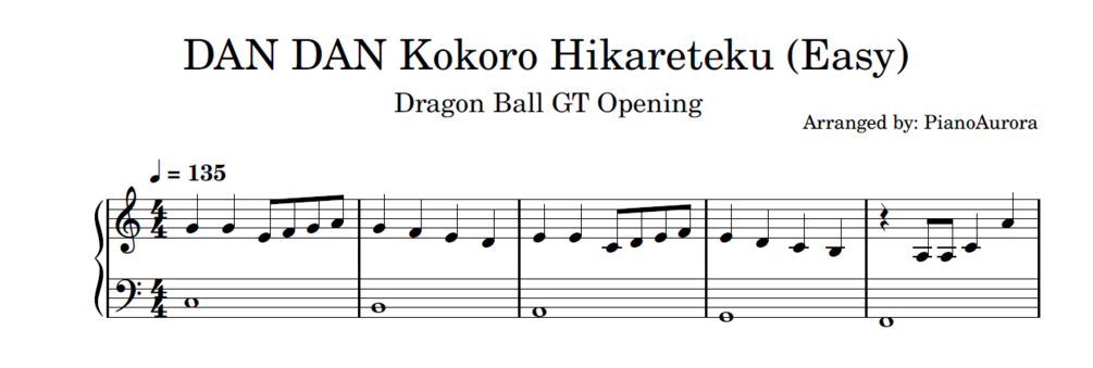 Easy piano arrangement of Dragon Ball GT Opening - "Dan Dan Kokoro Hikareteku"